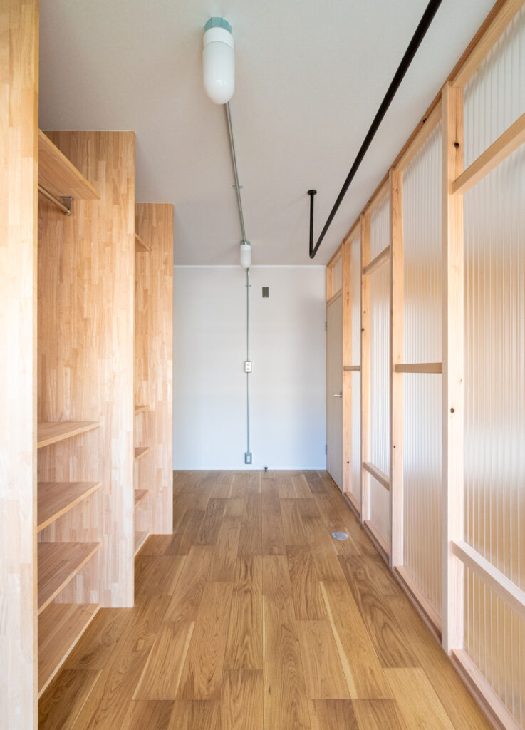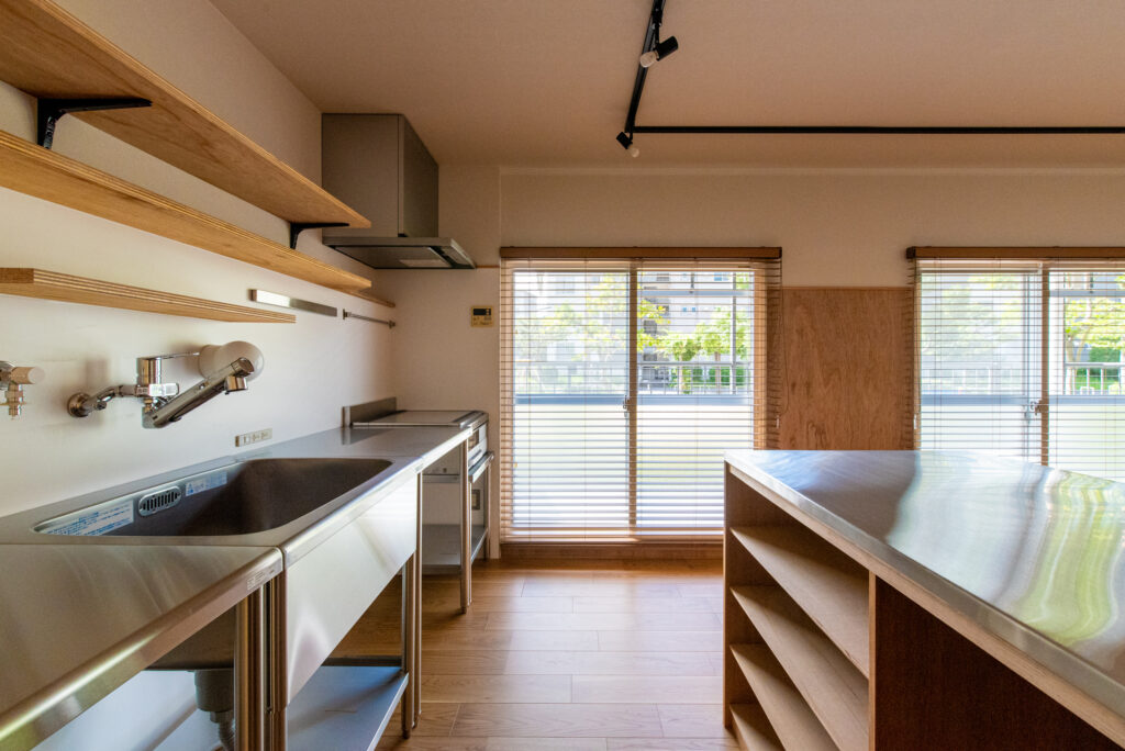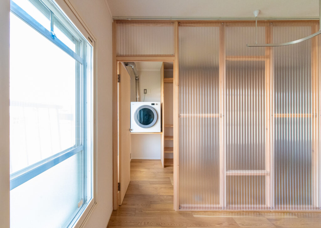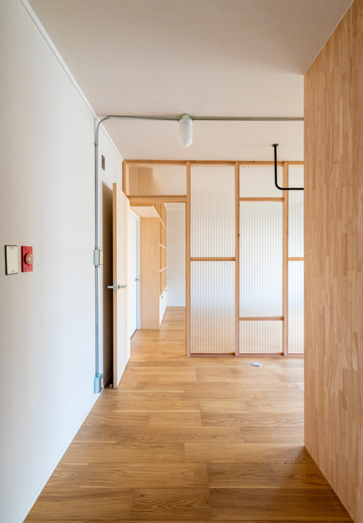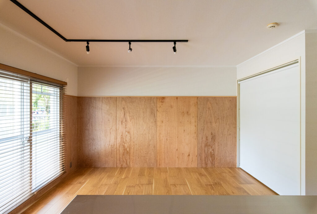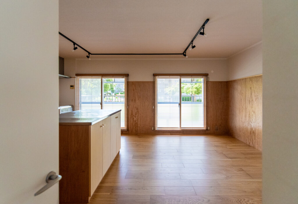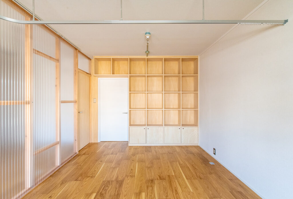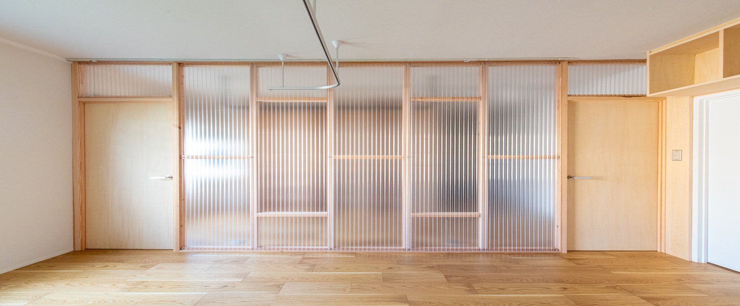 | 滋賀県大津市に建つ築46年RC造共同住宅。 リビング南側に公園が広がるロケーションの良い最下階の一室を住宅設備や断熱性能を整えながらな、“余白”あるリノベーションを目指しました。 マンションならではの最下階の断熱環境を開口部と床に着目し補強を行い、変更しづらいキッチン配置も現場での調査を繰り返しながら、動線と収納を効率的にまとめたシンプルな間取構成としています。北側に配置されている2室の続間は機能部の「核」としてのランドリーと将来の子供部屋として連続させ、透過性の高いポリカ材で間仕切りを新設することで明るく開放的な印象の空間になりました。 断熱改修を基に組立たシンプルなリノベーションプランですが、木の優しい表情を取り入れながら、後に住まい手が棚をつけたりアートを飾ったり、新しい暮らしを自分の色に染めていけるよう“余白”を意識したプランニングになりました。 |